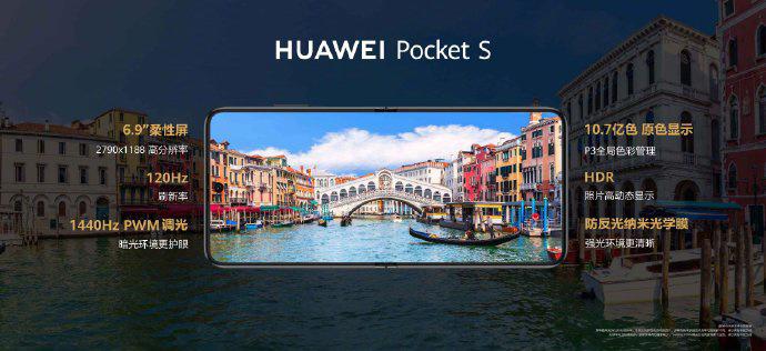 IT 之家了解到,配置上,华为 Pocket S 采用高通骁龙 778G 4G 处理器,辅以超冷柔性石墨烯散热;搭载 6.9 英寸 2790 × 1188 分辨率 OLED 屏幕,最高支持 120Hz 刷新率,1440Hz 高频 PWM 调光,300Hz 触控采样率,支持 10.7 亿色,P3 广色域;外屏采用 1.04 英寸 340 × 340 圆形 OLED 屏幕。华为 Pocket S 还支持 HDR Vivid 视频显示,色彩及层次更丰富,明暗对比更强。同时还采用了防反光纳米光学膜,阳光下也清晰。