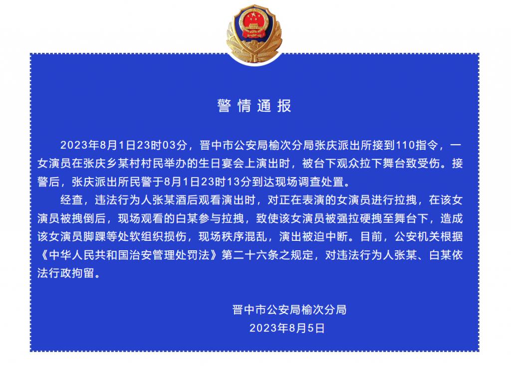 8 月 5 日,山西省晋中市公安局榆次分局就山西女歌手被拽下舞台一事发布警情通报。