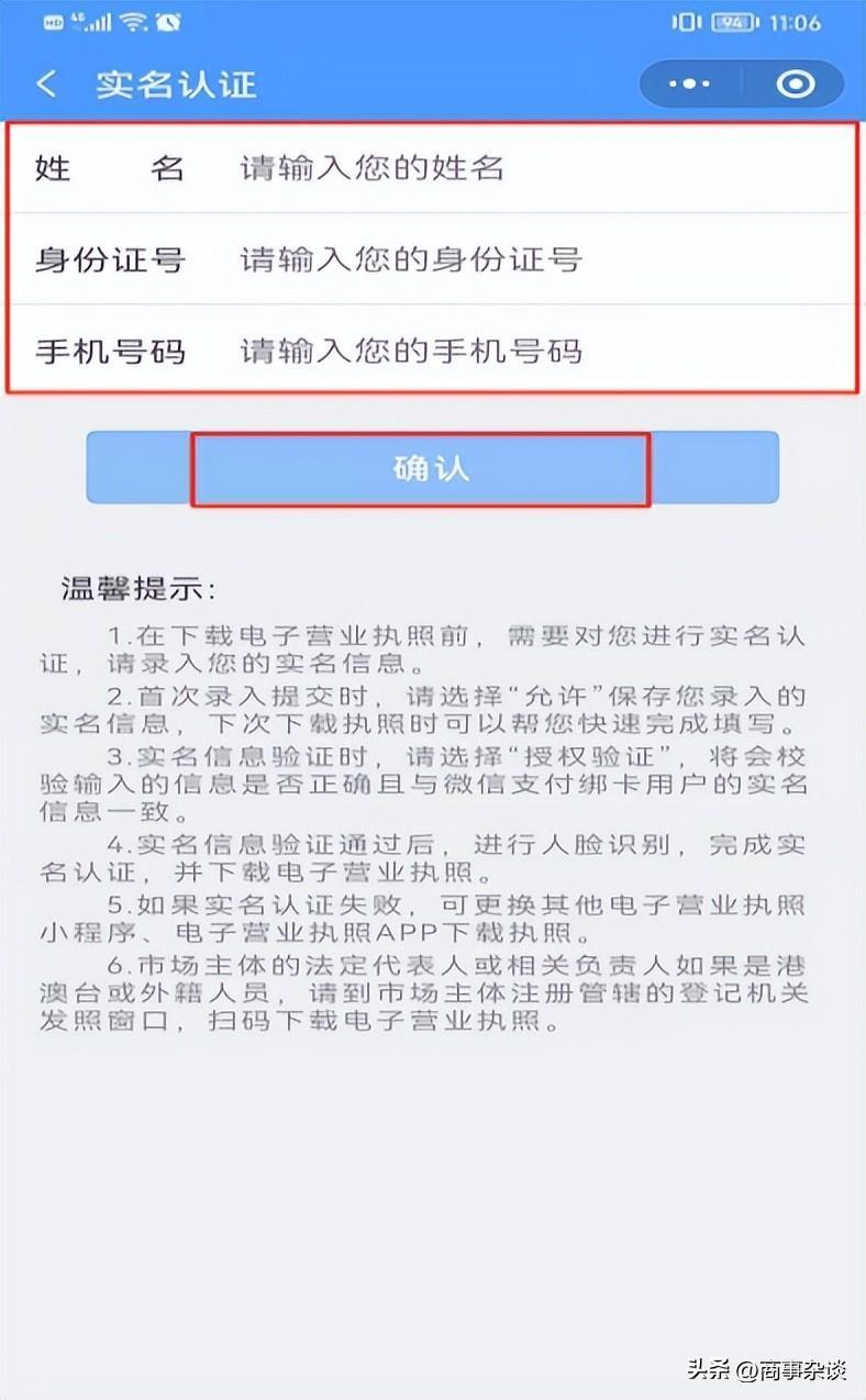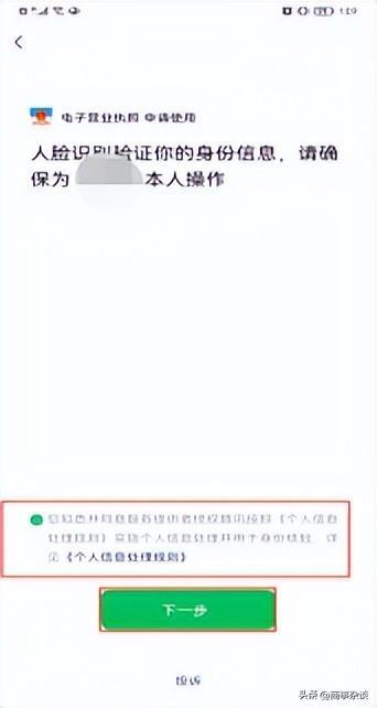 二、选择“下载执照” 输入“姓名、身份证号、手机号码”,点击“确认” 选中“你已阅读并同意……”,点击“授权” 面向屏幕进行扫脸认证。