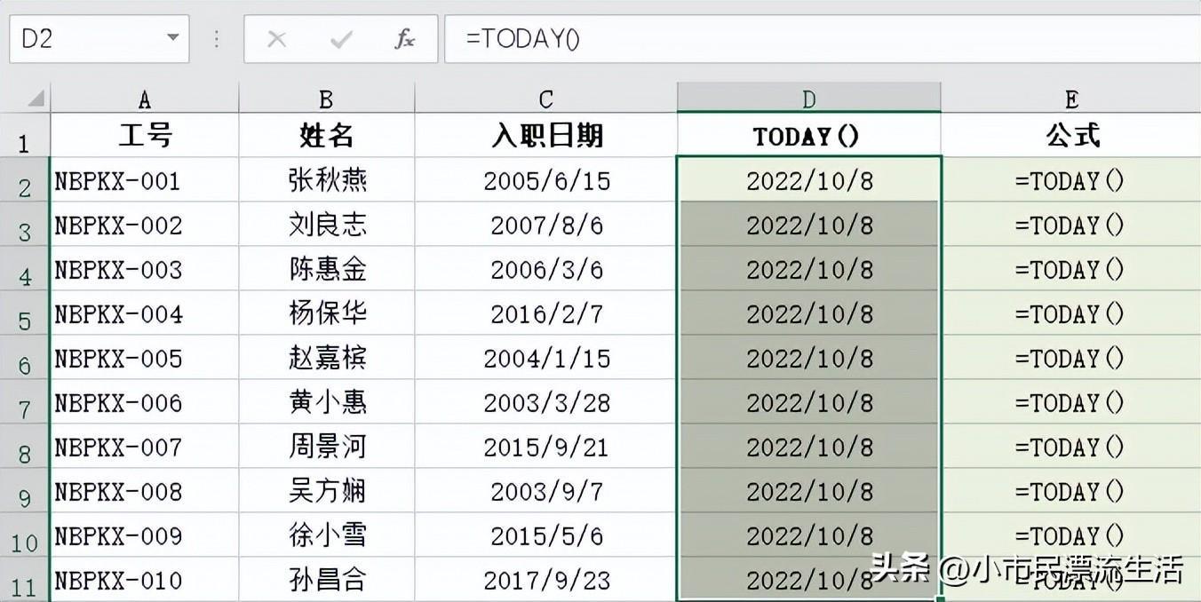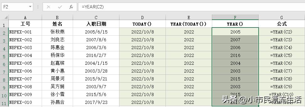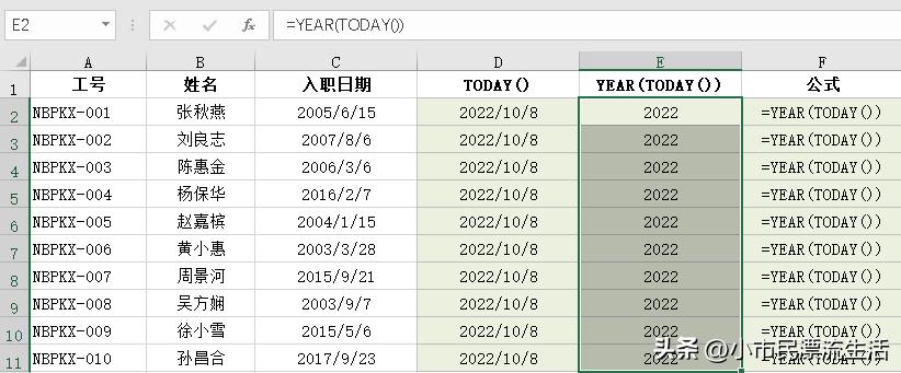 案例公式 =YEAR(TODAY())-YEAR(C2) 解析,其中 =TODAY() 部分获取当前日期 2022年10月8日,如下图