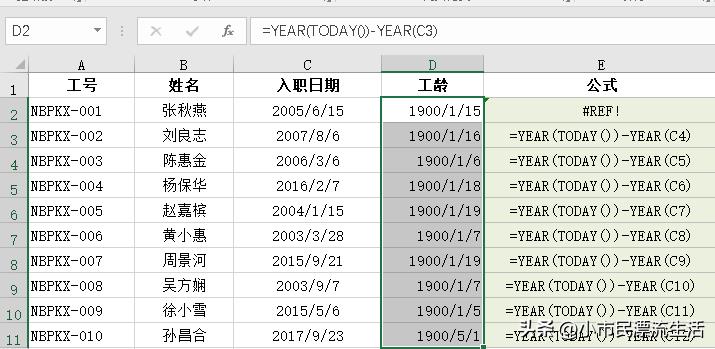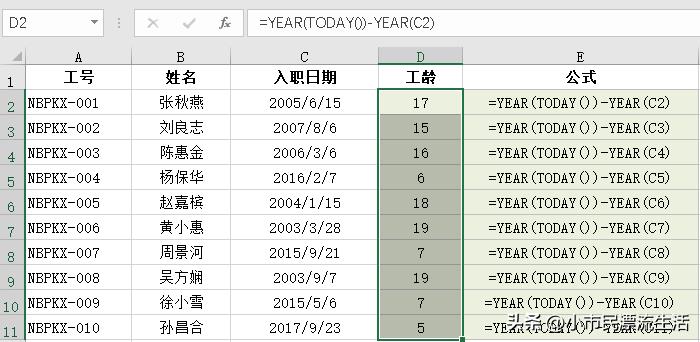 最后将公式合并在一起 =YEAR(TODAY())-YEAR(C2) ,使用当前日期的年份减去入职日期的年份就是员工工龄。