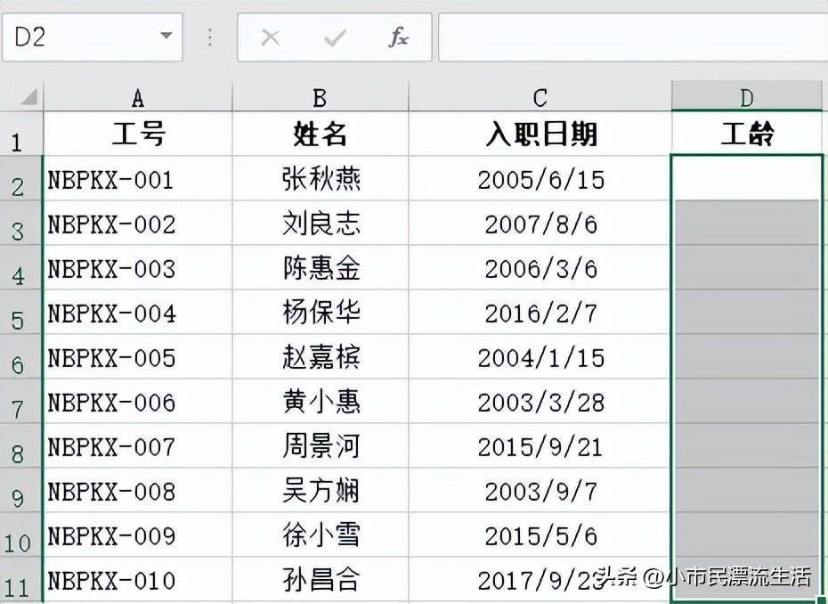 选中D2单元格输入公式 =YEAR(TODAY())-YEAR(C2) ,按enter键运算公式,ctrl+c复制D2单元格公式,再选中D3:J11单元格区域ctrl+v粘贴,完成D2单元格公式相对引用式粘贴,此时就计算出所有员工的工龄数。