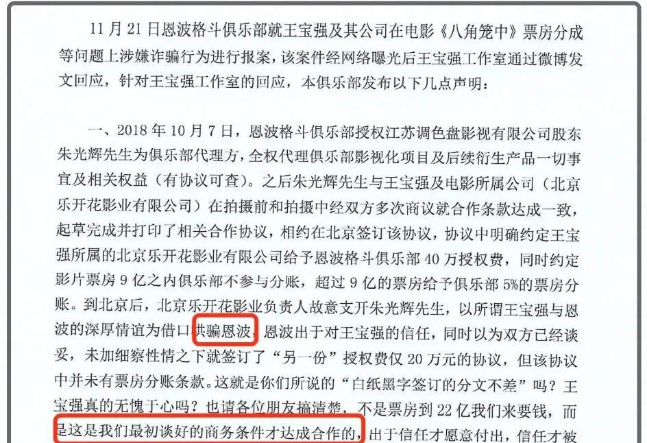 事情是这样的:2024年11月25日,网上突然爆出恩波格斗和王宝强闹矛盾的新闻。说是两边谈合作,结果谈崩了。恩波那边一开始要价40万授权费加5%票房分成,理由是他们要投入很多精力。王宝强这边觉得太贵了,最多给20万。恩波觉得这价钱太low,想让王宝强重新考虑考虑。