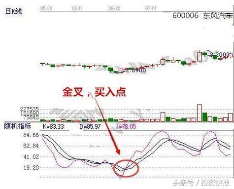 J值、K值同时从下往上穿过D值。分两种情况:股价经过长期下跌,