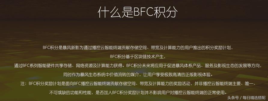 暴风播控云除了可以用做家庭影院,存储等。还可以挖BFC积分,BFC积分可以换取暴风的产品(具体可换产品详情见图),BFC积分是否可以第三方交易,官网暂无说明。