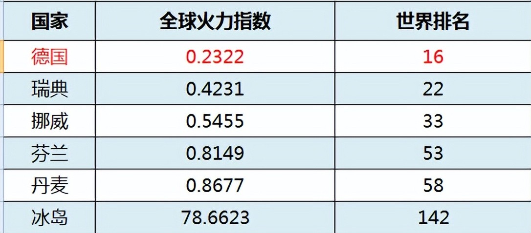 根据全球火力网发布的《2022年全球火力指数》显示,德国位列全球第16位。北欧五国中,瑞典的军事实力最高,位列第22位;其次是挪威,居第33位,再次是芬兰,居第53位,再次是丹麦,居第58位,最后是冰岛,居第142位。