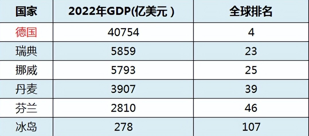 综上所述,北欧五国2022年GDP总和为18647亿美元,还不到德国的一半。因此,在经济实力上,德国完胜北欧五国。