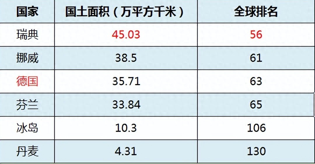 而德国的国土面积为35.71万平方千米,位列全球第63位,低于瑞典和挪威,高于其他三国,属于中型国家。