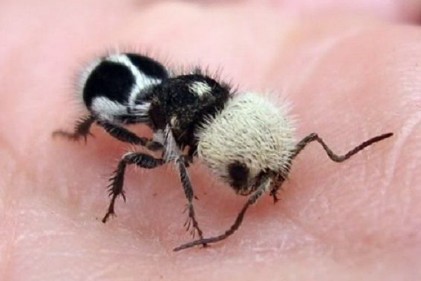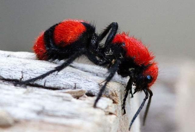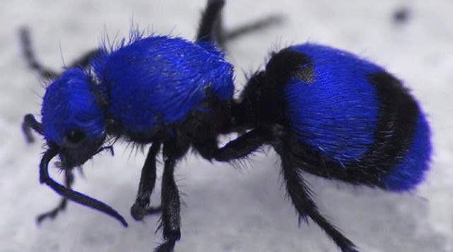 全球大约生活着5000多种天鹅绒蚂蚁,它们的颜色有白色、蓝色、金色、黑色、银色和红色。它们可不是蚂蚁,而是一种脱掉了翅膀的雌性黄蜂。它们也都不好惹,虽然没有了翅膀,但依然有毒性剧烈的蜂刺。一旦被它们扎到,据说是非常痛的。有人甚至称,被它们多扎几下,一头牛也能被它们杀死。