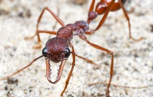 牛头犬蚁:澳大利亚的斗牛犬蚁是世界上最大的蚂蚁之一。成年斗牛犬蚁的体长超过25毫米。斗牛犬蚁的性情很凶暴。它们拥有锋利的锯齿状颚部和坚硬的蜇刺,敢于对抗任何挡路的敌人。