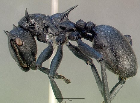 体形:身长可达到1.5厘米;特征:弯曲的刺极易刺穿皮肤。2007年在柬埔寨的维拉奇国家公园被发现,这种蚂蚁成群生活在森林地面上的枯树干的巢穴内。受到攻击时,它们用钩子彼此钩在一起,让捕食者很难对个体展开攻击。实际上,这种钩连并不是一种有意行为,但却是一种有效的防御机制。