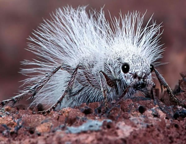 摄影师罗伯特-延森在美国加利福尼亚州莫哈韦沙漠中旅行时发现了一只长相怪异、小巧玲珑的小动物。这种动物全身长满了毛绒绒的白色毛发,好似一只惹人怜爱的小宠物。不过,人们需要小心的是,千万不要被它可爱的外观所迷惑,它的真名为蓟花冠毛蚁,又名为母牛杀手蚁。这种只有大约2.5厘米长的小动物,其实是一种无翼雌性黄蜂,它最可怕之处在于它惊人的杀伤力,只需要一根毒刺就可以将受害者放倒在地。