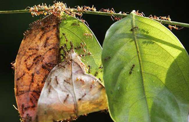 织工蚁的名字源自其独特的生活习性,一群蚂蚁一起协同工作,吐出丝将新鲜树叶捆起来形成巢穴,寿命可达到8-10周。