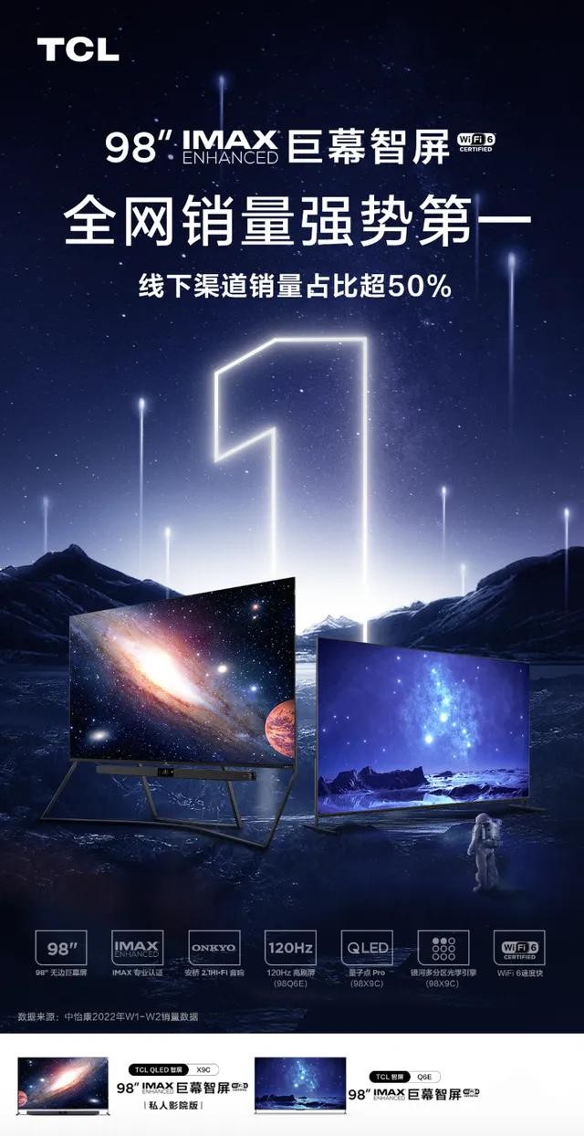 TCL去年发布的98英寸智屏产品——98Q6E和98X9C,分别凭借超高性价比和影院级别音画体验,销量突破10000台大关,并在2021年取得了全年行业销量第一的成绩。中怡康最新数据进一步显示,2022年W1-W2期间,TCL延续了去年的优异表现,继续以51.62%的线下销量占比和50.06%的线下销售额占比双双强势登顶榜首。