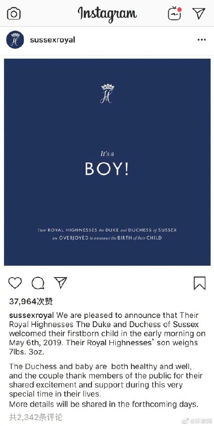又一位小王子!哈里王子激动宣布梅根王妃诞下男婴