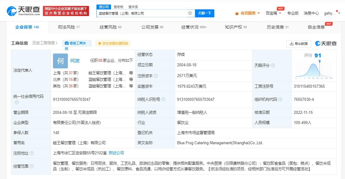 据报道,近日,媒体曝光网红西餐厅蓝蛙后厨:制作沙拉的水果竟然有发黑发烂的;超过保质期的蔬菜依然能用;食材有效期标签随意更换;抹布不做区分,擦完刀具擦垃圾桶;海鲜池里放完拖布桶再洗菜……天眼查App显示,该网红品牌关联公司为蓝蛙餐饮管理(上海)有限公司,其成立于2004年8月,法定代表人为何波,注册资本2571万美元,经营范围包括餐饮管理、餐饮服务等,由New Precision Limited全资持股。风险信息显示,该公司曾因健康权纠纷被起诉。此外,该公司共和新路分公司曾因自制南瓜牛油果沙拉抽检不合格,被罚款5万元。