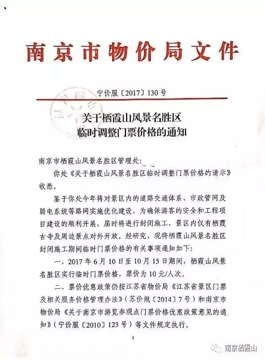 栖霞山风景名胜区管理处近日发布消息称,因栖霞山风景名胜区今年将对景区内实施优化建设,景区内仅有栖霞古寺及周边景点对外开放。故临时调整门票价格,在2017年6月10日至10月15日期间,栖霞山风景名胜区票价为十元/人次。
