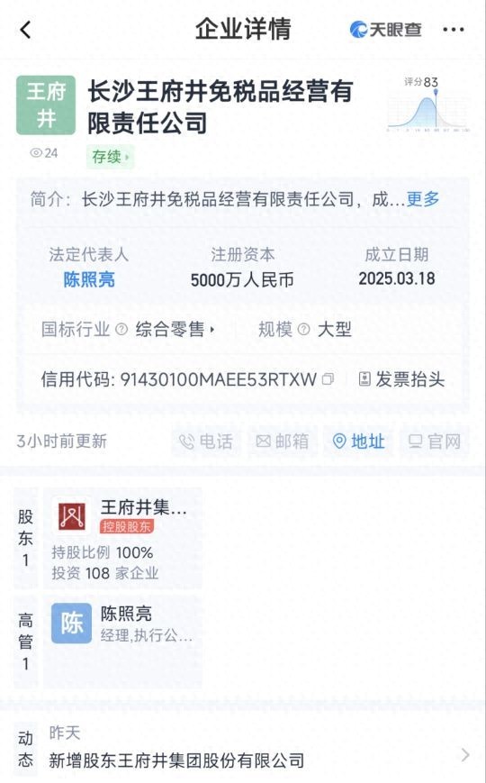 股权穿透信息显示,该公司由王府井集团股份有限公司全资持股。