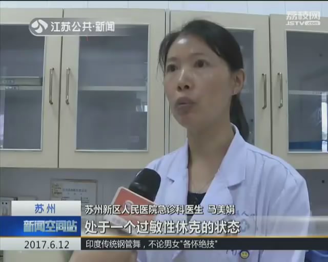 苏州新区人民医院急诊科医生马美娟说,患者到达急症室的时候,感觉到头晕胸闷、全身红疹。医务人员测量血压后发现,因为血压很低,当时患者已经处于过敏性休克的状态。