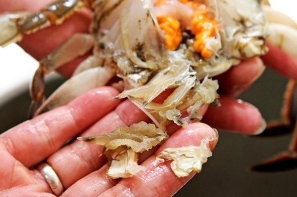第二步:左右手大拇指深入向两边分开,就可以打开背甲,大拇指不要太用力,像是三点蟹壳薄又脆,很容易就能将背甲掰碎。(如图2)