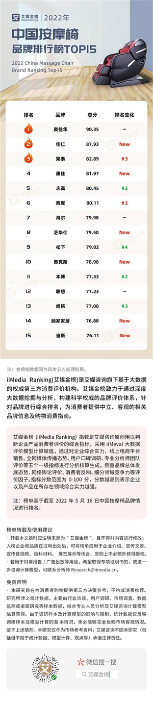 艾媒金榜|2022年中国按摩椅品牌排行榜Top15