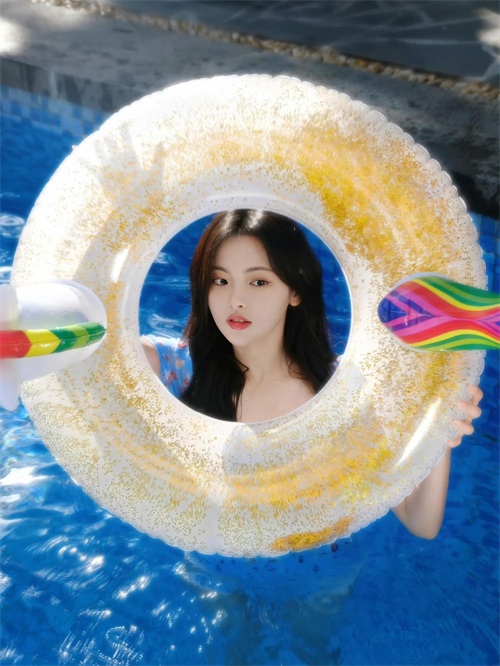拿着泳圈套在头上,非常俏皮可爱。