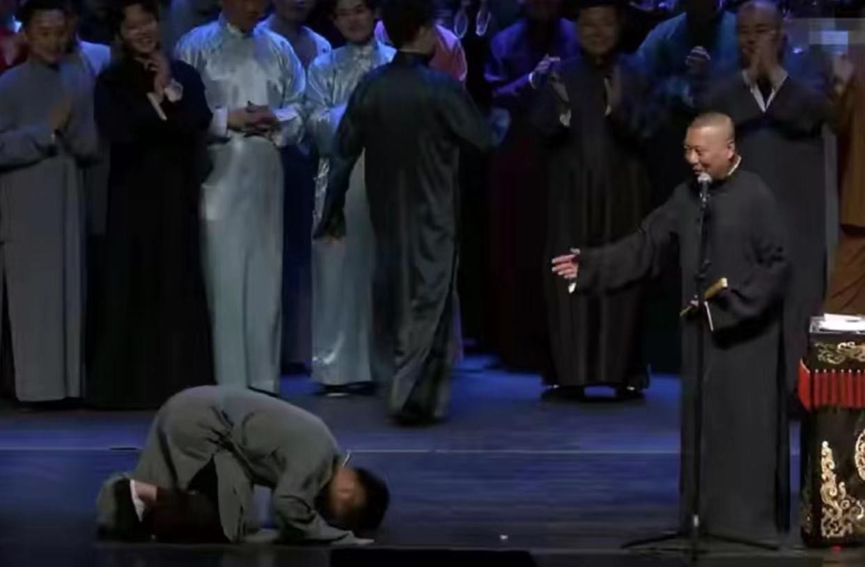 当时,原本和大家站在一起的张九龄非常激动,一激动就来到了郭德纲旁边,对着郭德纲连连磕头。