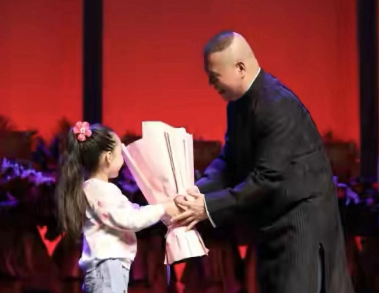 另外,郭德纲表演完之后,有一位十来岁的小女孩上台献花,而郭德纲还将小女孩抱起来,隆重向大家介绍:她正是恩师侯耀文的外孙女,介绍完之后,场下观众也献上了热烈的掌声,自夸郭德纲有情有义。