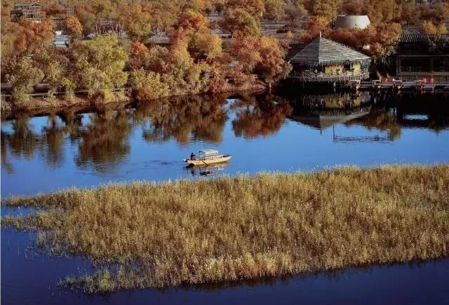 “胡杨海”景观区的核心面积达四千亩,是巴楚三百一十六万亩“胡杨林国家森林公园”的冰山一角。新疆大部分的胡杨林,都在干涸的沙漠地带,可巴楚的“胡杨海”景观区河流环绕,湖泊成片,一派江南水乡的景象。景区内有耕作的农民,放牧的牧工,还有飘溢着羊肉香气的饭馆,简直是田园诗中生活的再现。这里有“胡杨博物馆”“丝路第一馕坑”“谒者馆”“中央部落”“篝火广场”,我们登上观景塔,天高云淡,微风习习。一望无际的胡杨,漫延到了天边,叶尔羌河缓缓环绕着成片的胡杨徐徐地流过,河边上鹳和鹤亭亭玉立,斑头鸭在河里上下窜舞,猎取着小鱼。这像回到了陶渊明的《桃花源》里,恬静、高远和舒畅。“胡杨海”不仅有胡杨的沧桑和勇武,还有胡杨的柔美和灵秀。在巴楚的“胡杨海”景观区,人们会对胡杨有一个新的界定和诠释。