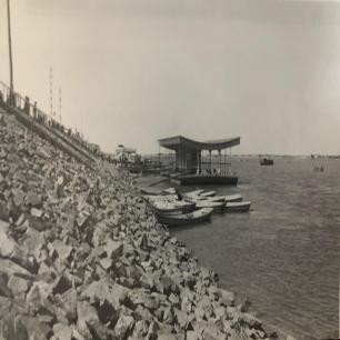 当年松花江南岸的石筑堤岸及江边的轮渡码头。