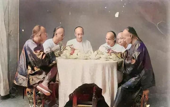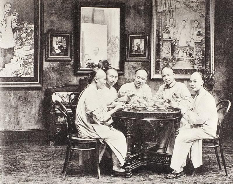 在一家照相馆内,几名男子正坐在一张圆桌前做出吃饭的样子。