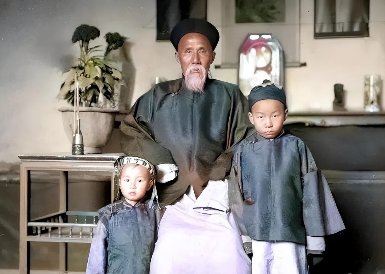 将军和他的两个小孙子的合影。看家里的条件应该不要是很好,桌子上没有什么摆件,衣服应该也是压箱底的