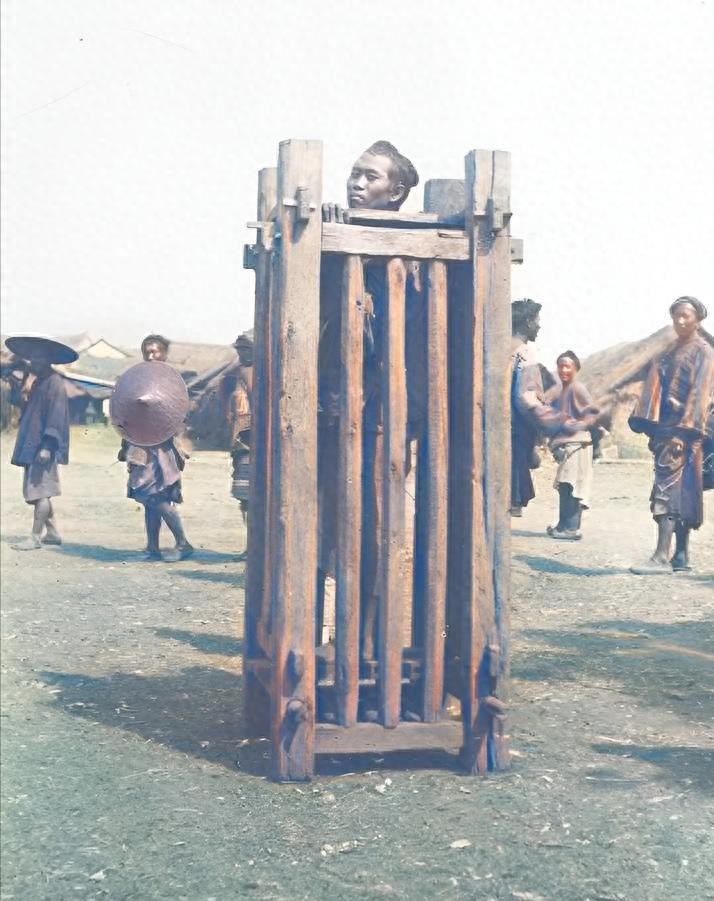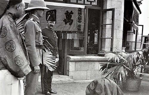 很明显这是清朝的罪犯,带着枷锁,而且头发是长长的辫子,很明显的标志。但是身后跟着的却是印度巡警。