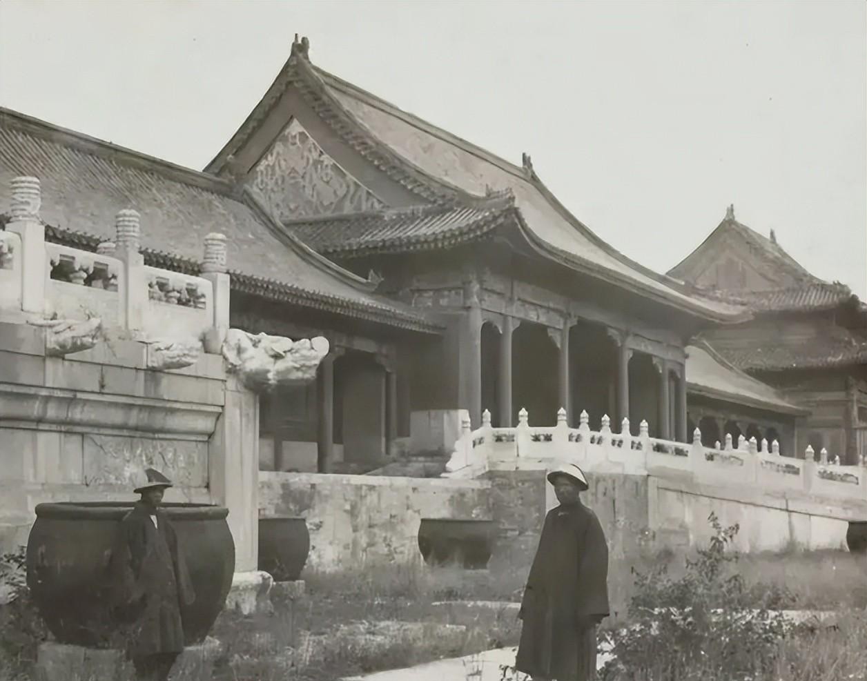紫禁城里的留守太监,正在那里发呆。他提着蒲扇,挺着大肚子,半人高的草也不去修葺,可见已经懒散成性。