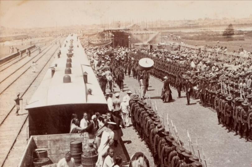 站台上有清军持枪列队,中间以伞盖打头的队伍缓缓走来,场外围观者甚众,一时间喧嚣热闹人山人海