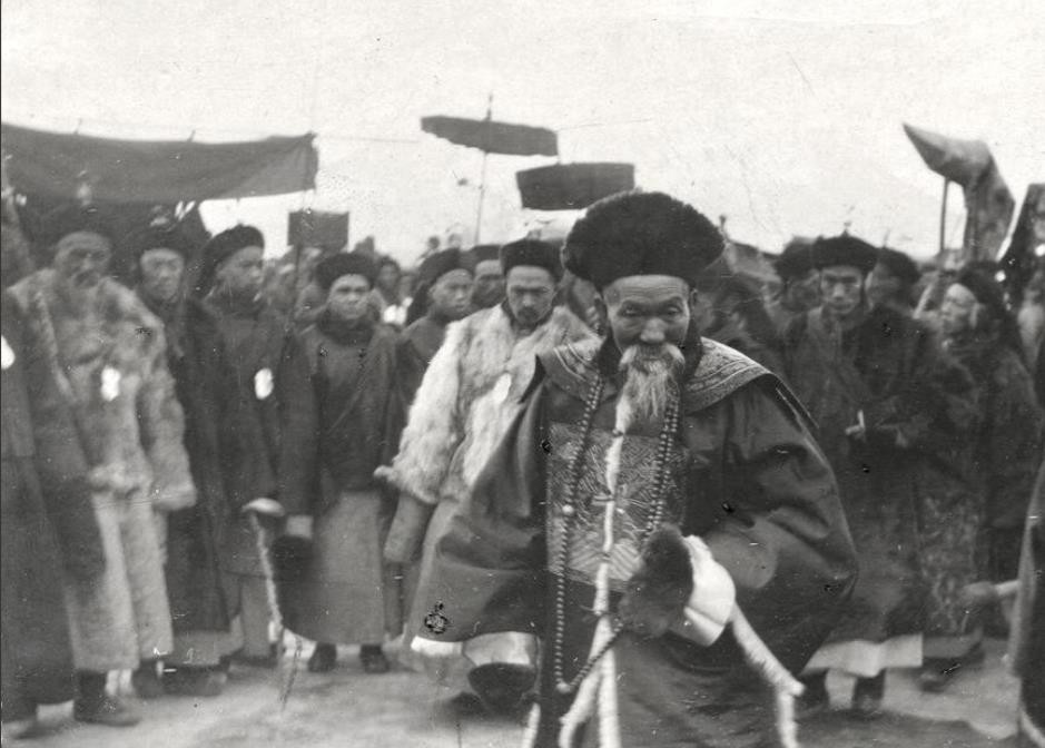一位穿着清朝官服的大臣,正在向洋人下跪