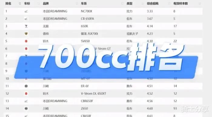 该级别中本田NC750X以3.33升的绝对优势位居第一,紧跟其后的是街车版无极650R为4.06升。而其他车型基本上都在4.5升左右浮动。
