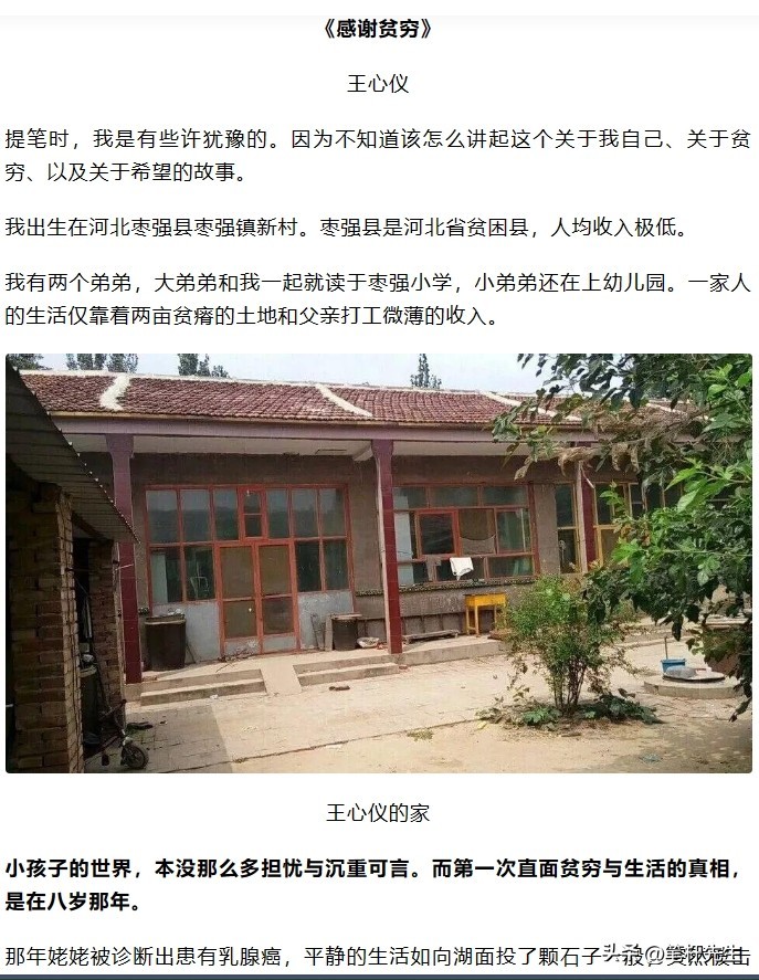 让所有人都印象深刻的是她刚入学在新生开学典礼上的那篇文章《感谢贫穷》,在场无数人闻之落泪,对王心怡充满了敬佩。