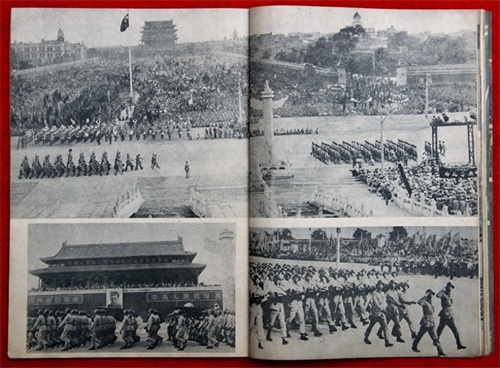 那时,东西三座门(正式名称为、长安右门)及南面长长的甬道,甬道两边长长的红墙,正南门即砖石结构的都还存在,形成了一个丁字形的封闭会场。与8个月前北平刚时的天安门前比较,可说是焕然一新,宽广平坦得多了。此外在现在国旗旗杆的地方已竖了一根当时看来已很高的旗杆,旗杆上有一个金色的顶。中华门外正阳门、前门箭楼两旁的许多建筑物上都张灯挂旗。"北平东站""北平西站"的大字一夜间都改成"北京东站""北京西站"了。会场里的工人、学生、干部、市民、城防部队都举了临时赶制的五星红旗及其他红旗、红灯和彩色小旗,特别是用红绢糊的大小不同的五角星灯,真是成了红旗红灯的海洋,只有市民中戴了小白帽的回民同胞举着绿底白色的星月旗,显得分外不同。会场上的群众共达30万人,分区席地而坐,很有秩序。北没有现在的观礼台,但搭了两个简单的台子,一个供大会指挥用,一个给唯一的外宾观礼团,这就是前一天刚到的以法捷耶夫为首的苏联文化艺术科学工作者代表团。受检阅部队则站在。