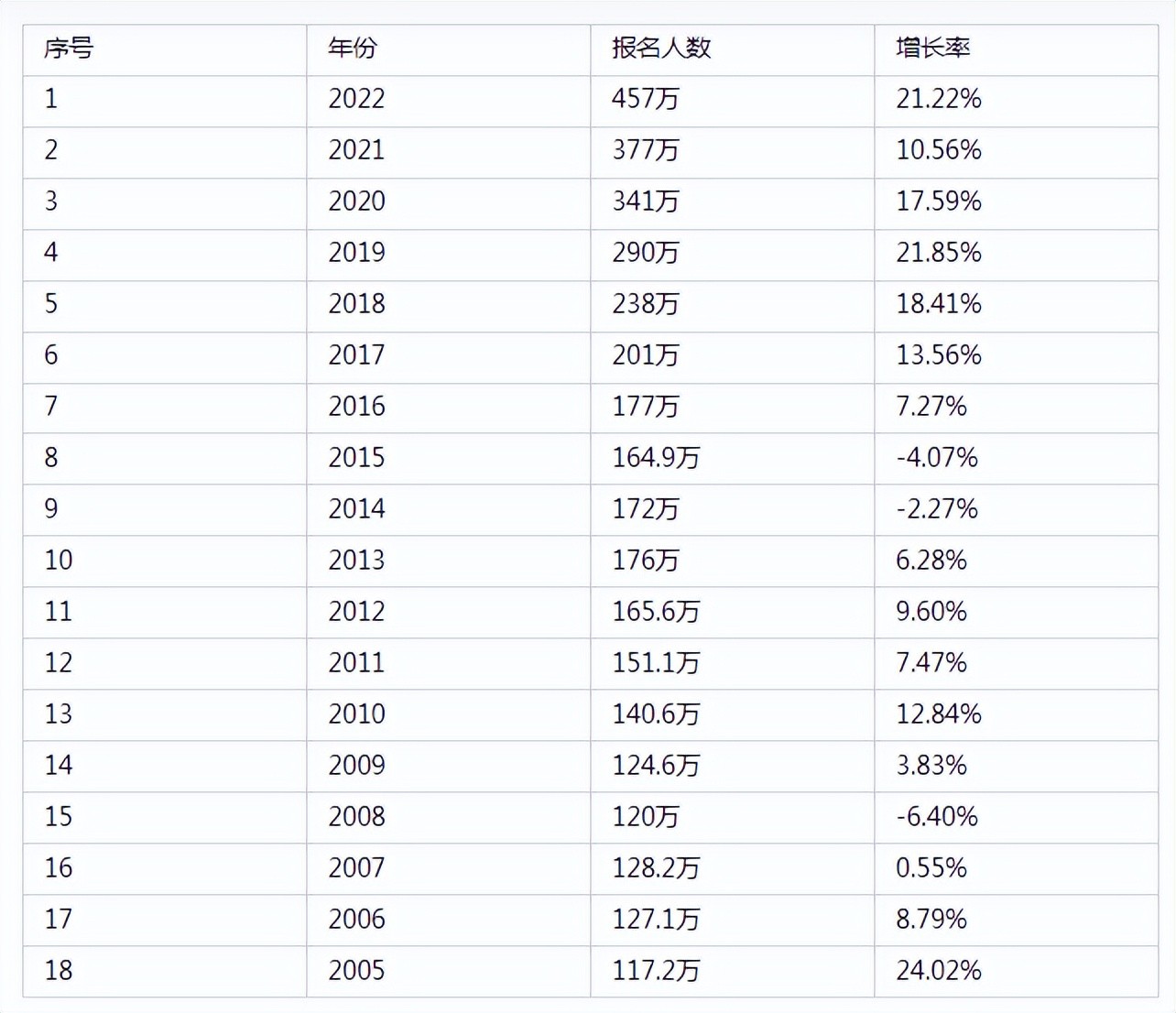 序号年份报名人数增长率12022457万21.22%22021377万10.56%32020341万17.59%42019290万21.85%52018238万18.41%62017201万13.56%72016177万7.27%82015164.9万-4.07%92014172万-2.27%102013176万6.28%112012165.6万9.60%122011151.1万7.47%132010140.6万12.84%142009124.6万3.83%152008120万-6.40%162007128.2万0.55%172006127.1万8.79%182005117.2万24.02%