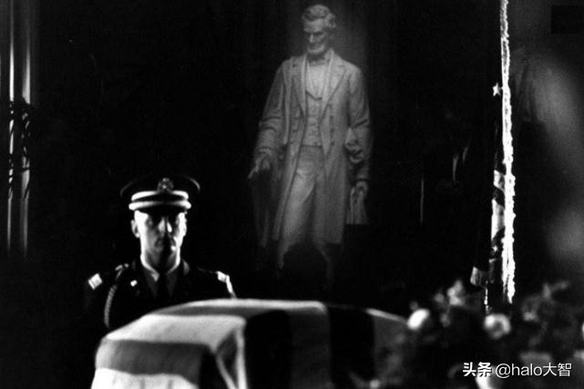 1963年11月24日,美国国会圆形大厅内,肯尼迪的灵柩正摆放在同样是遇刺身亡的林肯总统的雕像下。