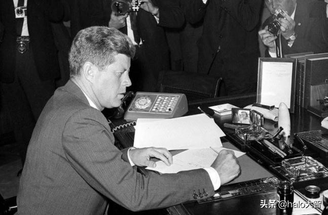 1962年10月23日,白宫,肯尼迪被摄影师包围,拍照不久后,肯尼迪签署了有关古巴导弹危机的总统公告,随后美军的航母编队将古巴外围的海域全面封锁。