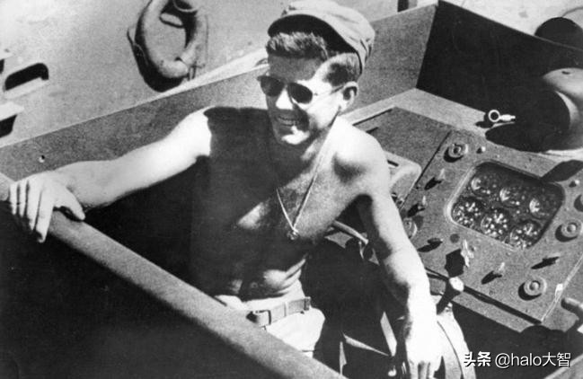 1940年小约翰肯尼迪从哈佛大学毕业,其批评英国缨靖政策的论文出版并大卖。随后,小约翰肯尼迪请父亲以“开后门”的方式使其参军,并由后方情报军官转而担任前线鱼雷艇艇长。图为1942年3月4日,小约翰肯尼迪在太平洋战区前线任PT-109鱼雷艇艇长。