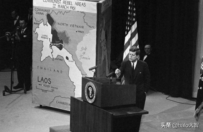 1961年3月,肯尼迪在此电视媒体会 议上介绍美军支援南越政权的情况。肯尼迪向南越政权派出了军事顾问和特种部队,1963年美国政府颠覆了南越吴廷淡政权,在肯尼迪遇刺后,有限干预演化成全面作战,美国彻底陷入越战泥潭。