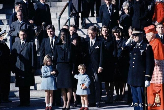 1963年11月25日,肯尼迪的遗孀杰奎林拉着孩子凯罗琳和约翰的手站在华盛顿圣马太大教堂外,为肯尼迪举办葬礼弥撒。