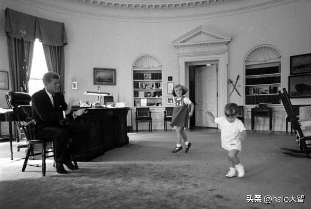 1962年12月,肯尼迪在白宫办公室里与女儿卡罗琳及儿子小约翰玩耍。肯尼迪与杰奎琳总共育有4个子女,其中2个天折。