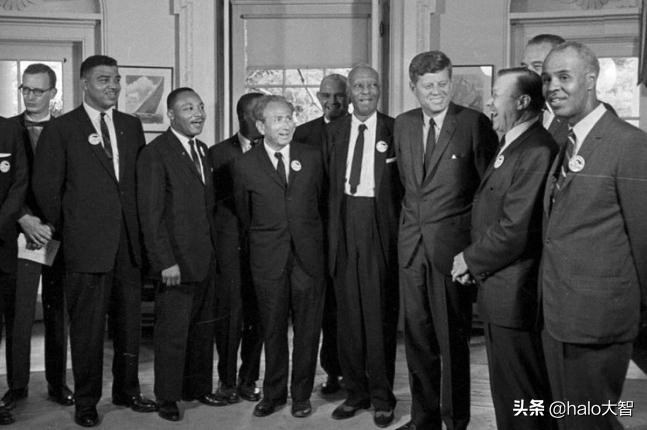 1963年8月28日,在马J路德金完成游行并发表完《我有一个梦想》的演说后,肯尼迪与马丁路德金等民权运动领袖进行会晤。