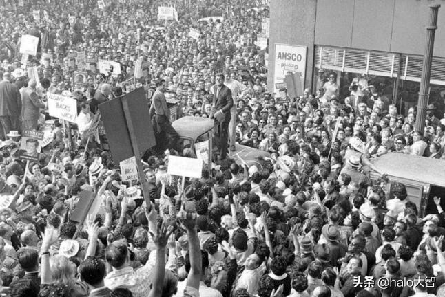 1960年9月1日,洛杉矶街头,肯尼迪向他的支持者致意。