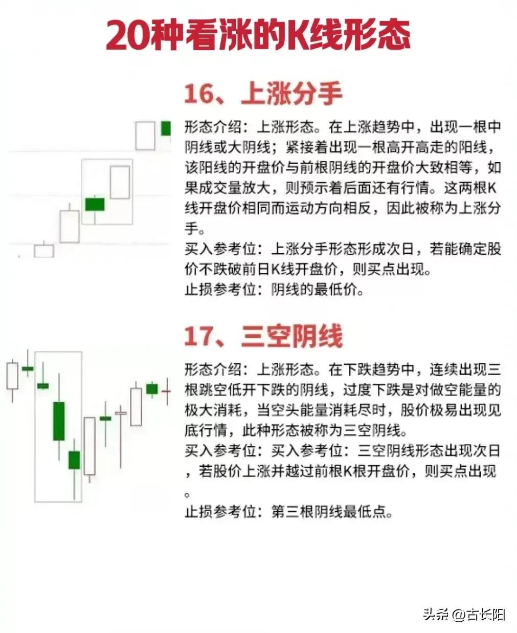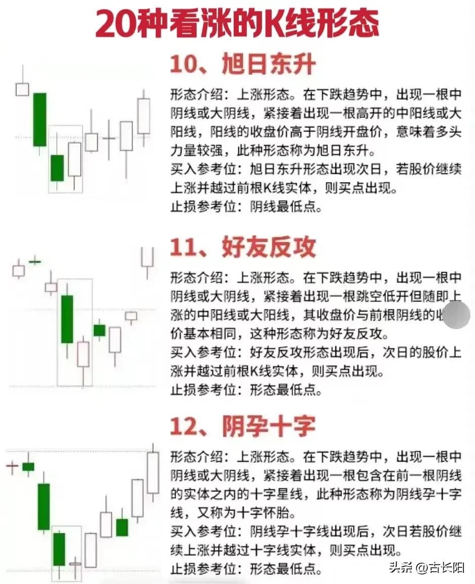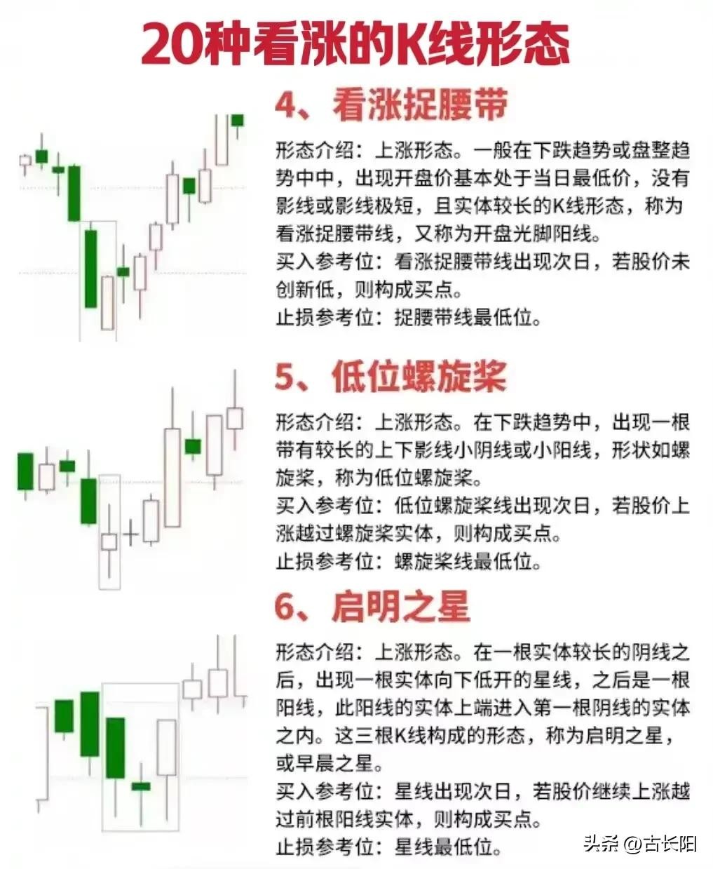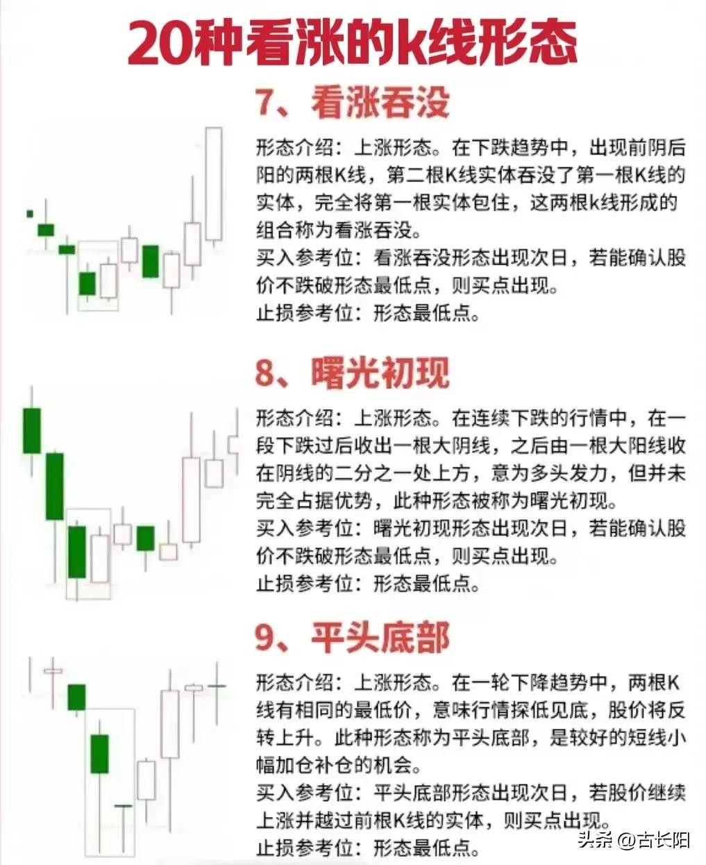 阳哥这里把股票的20种底部看涨形态分享给大家,具体的如下图。大家可以去好好研究研究,觉得有帮助的也可跟其他朋友分享。