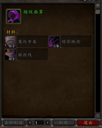 需要的材料,魔纹布卷,暗影蛛丝,粗丝线(裁缝供应商出售)。